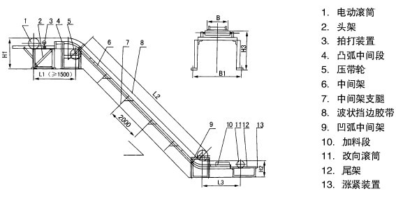 (3)輸送高度最大70m,最大粒度應(yīng)小于擋邊高30-40mm。